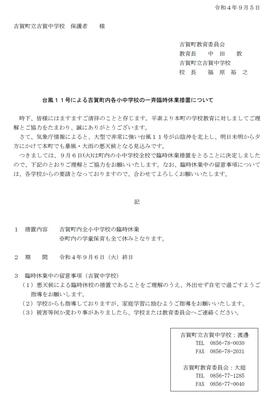 なお、今後台風の状況により特別な措置をとる場合は改めて連絡をいたします。